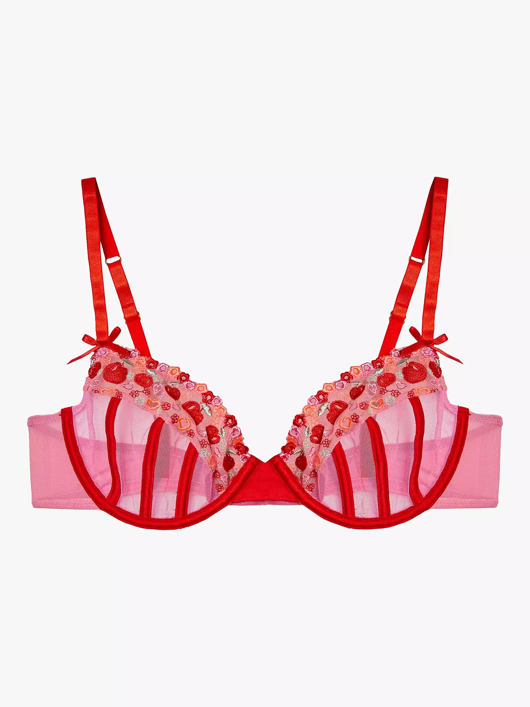 Este adorable sujetador color cereza rosa y rojo nos da mucha alegría. Este sujetador está bordado con corazones y cerezas rosas en la parte delantera, con pequeños detalles de lazos rojos y una espalda de malla. Este artículo tiene aros, tirantes ajustables y cierre de tres ganchos.