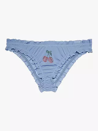 This shade of periwinkle is between the colors of blue and violet. These playful and sensual panties are chiffon frill hipster with a full back. They have a crystal diamante cherry detail on the front.